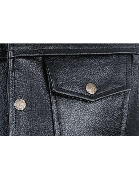 Kamizelka motocyklowa skórzana męska KM025 Anarchy jest wykonana z naturalnej skóry bydlęcej o grubości 1,2-1,4 mm. Kamizelka motocyklowa KM025 Anarchy zapinana jest na zatrzaski, posiada również 4 zapinane kieszenie zewnętrzne, przy czym dwie z nich na zatrzaski, a dwie na zamki.