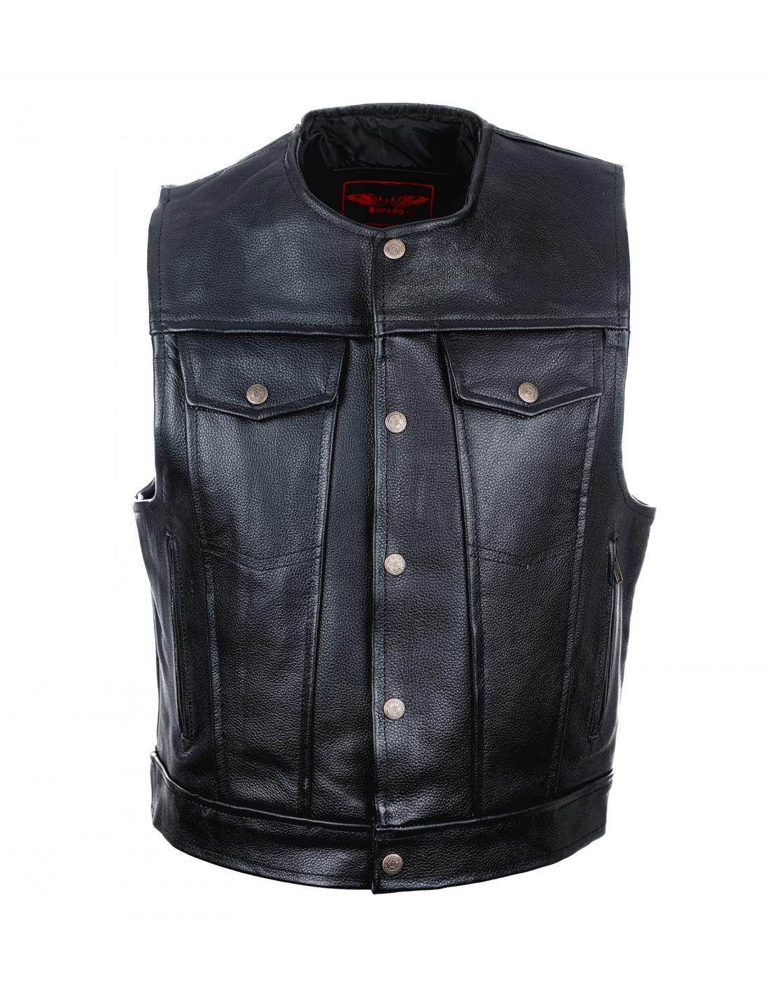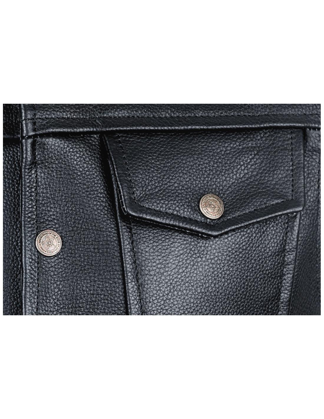 Kamizelka motocyklowa skórzana męska Anarchy marki L&J RYPARD jest wykonana z naturalnej skóry bydlęcej o grubości 1,2-1,4 mm. Kamizelka zapinana jest na zatrzaski, posiada również 4 zapinane kieszenie zewnętrzne, przy czym dwie z nich na zatrzaski, a dwie na zamki.